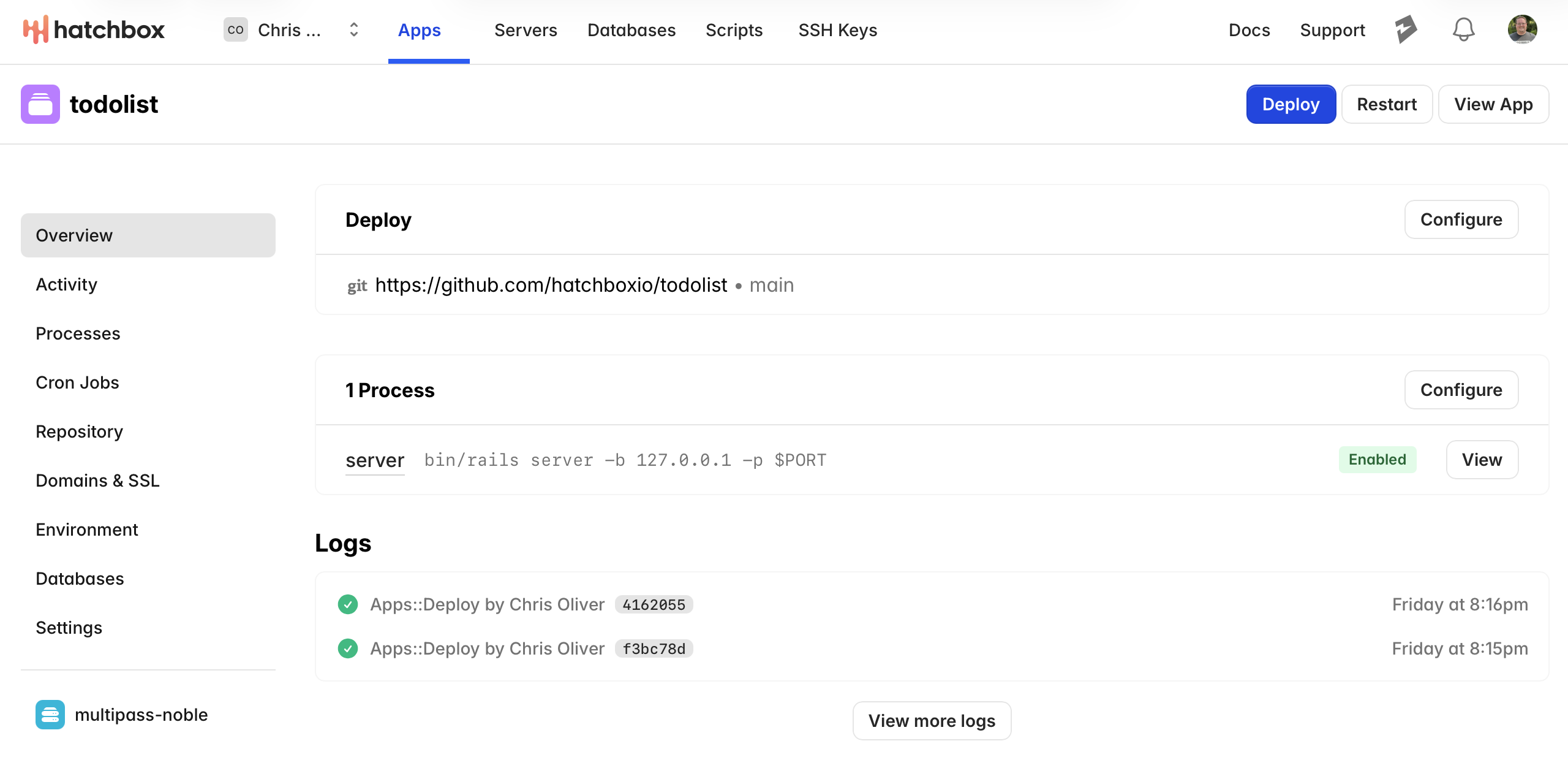 Create databases, env vars, cron jobs, processes and view logs all within Hatchbox.